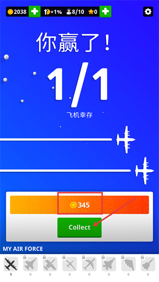 4、戰斗勝利后顯示【你贏了!-1/1飛機幸存】,獲取【345-獎勵】,點擊【Collect】按鈕領取該獎勵,完成本次行動。
