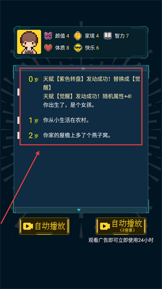 1、開局選擇【覺醒】類天賦觸發屬性加成,提升初始能力,助力后續人生發展更順利。