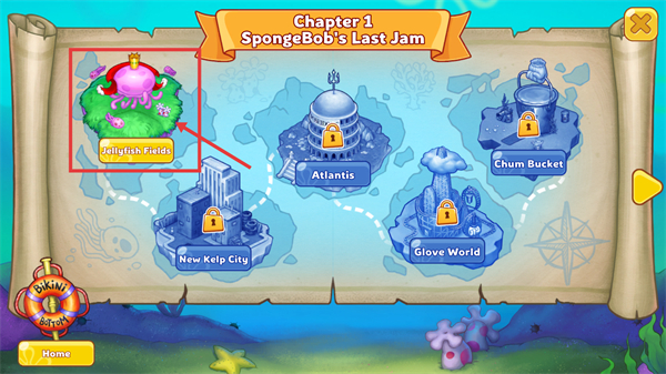1、進入游戲后,選擇標記的區域開啟探索,【Chapter1-SpongeBob's-Last-Jam】下僅該區域可進入,其余區域需后續解鎖。