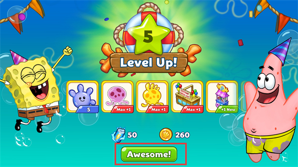 4、升級至【5-Star】會觸發【Level-Up!】界面,領取獎勵后點擊【Awesome!】按鈕,可獲得資源與功能解鎖。