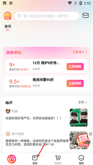 1、進入APP首頁,先在【領券中心】領取【12月-煤爐9折券】等優惠,點擊底部【發現】按鈕,進入對應頁面瀏覽內容。