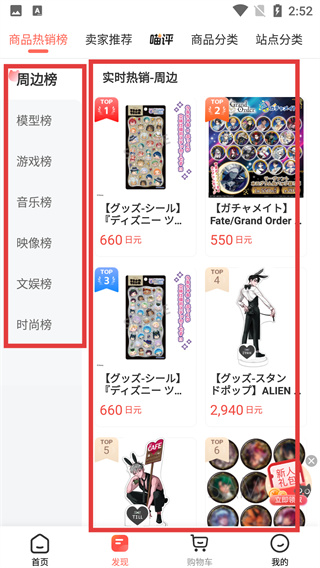 2、進入【發現】頁面,通過左側【周邊榜】、【模型榜】等分類,查看【實時熱銷-周邊】的商品列表,了解熱門好物。