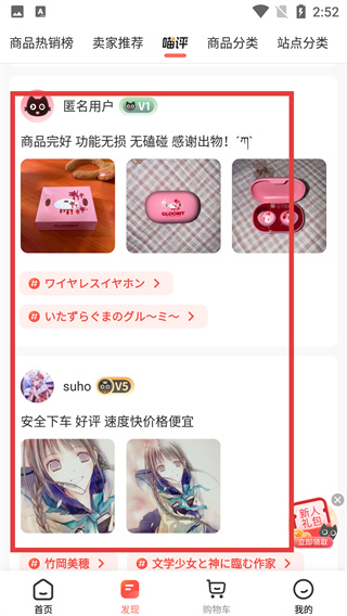 3、在【發現】頁切換到【喵評】板塊,查看用戶對商品的評價內容,通過【商品標簽】了解對應商品的信息。