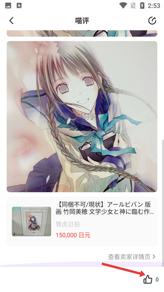 4、進入【喵評】詳情頁,查看商品的【150000日元】價格等信息,點擊【點贊】按鈕互動,還能查看商品詳情頁。