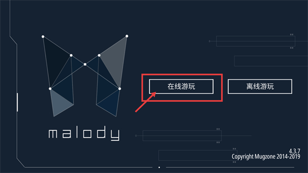 1、界面顯示【malody】標識,點擊標注的【在線游玩】按鈕進入在線模式,開啟音游關卡,推進游戲的節奏類游玩流程。