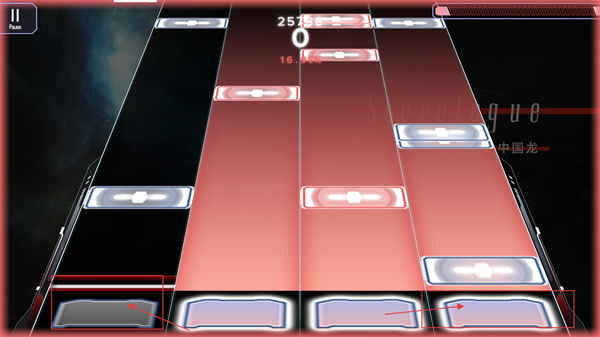 2、進入音游關卡,點擊標注的按鍵區域擊打對應音符,配合節奏完成操作,獲取分數,推進音游的關卡進程。