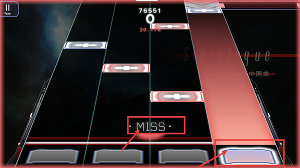 3、出現【MISS】提示說明音符擊打失敗,需調整按鍵時機,精準匹配音符下落節奏,避免失誤以維持分數積累。