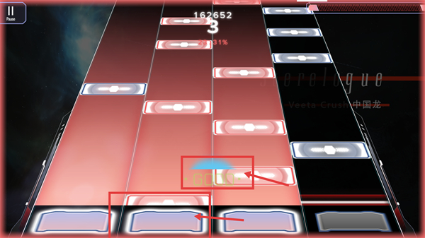 4、精準點擊標注的按鍵擊打音符,維持連擊狀態(當前顯示3),積累更高分數,持續推進音游關卡的進度。