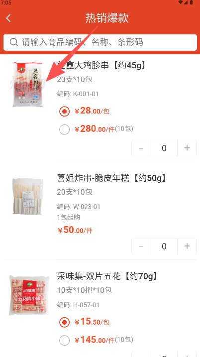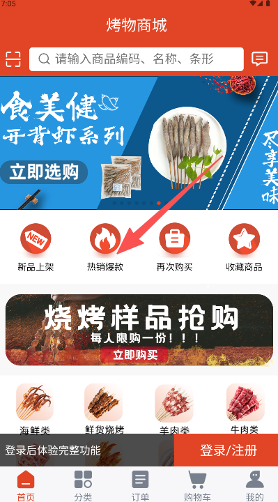 1、商品分類貼近燒烤場景,首頁鑫大雞胗串、食美健開背蝦系列等商品命名與圖片直觀,便于選擇。