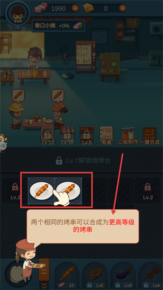 2、將兩個相同等級的【烤串】合并,合成更高等級的烤串提升菜品品質與收益。