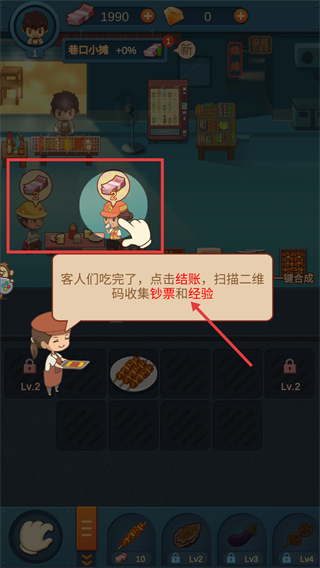 4、客人用餐完畢后點擊結賬,收集【鈔票】與【經驗】積累資源升級店鋪。