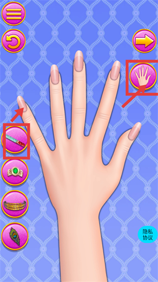 2、進入美甲界面后,先選左側紅色框選的裝飾,再點擊右側手掌按鈕,開始為指甲進行美妝裝飾的第一步操作。