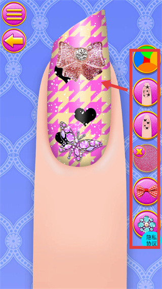 3、針對單根指甲,選擇右側紅色框選的裝飾元素(如蝴蝶結),添加到指甲對應位置,完成該指甲的個性化美妝設計。