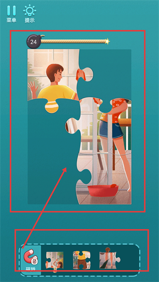 3、拼圖過程中,頂部倒計時變為【24】,繼續從紅色框選的底部拼圖塊選對應部分,拼接至圖中對應區域,推進拼圖進度。