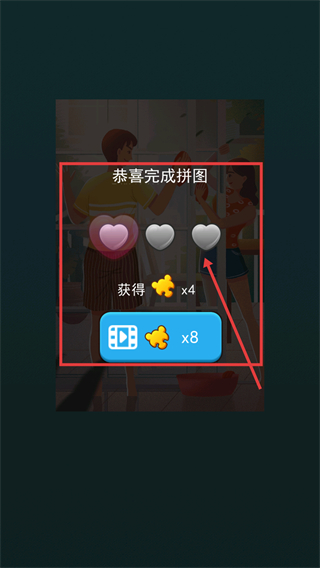 4、完成拼圖后出現【恭喜完成拼圖】提示,獲得【金幣-x4】,可選擇看視頻得【金幣-x8】,領取獎勵后可推進后續拼圖關卡。