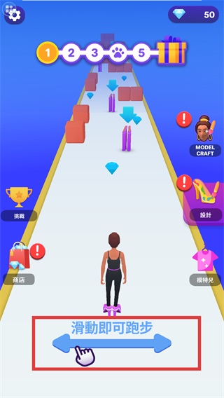 1、進入游戲后通過滑動屏幕操控角色開始奔跑,沿途拾取【藍色鉆石】與【紫色高蹺】,為后續挑戰積累資源。