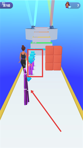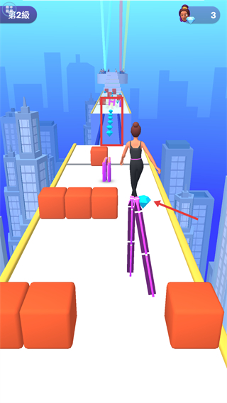 2、賽道中【藍色箭頭】指向的【紫色高蹺】可延長高蹺長度,收集它們能輕松越過前方紅色障礙。