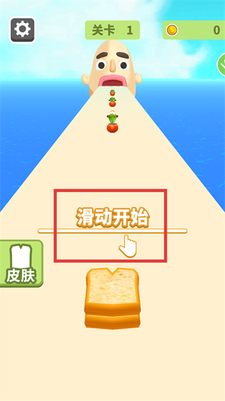 1、進入【關卡-1】界面,點擊【滑動開始】區域,啟動關卡讓食材向面包移動。