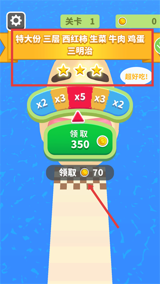 4、完成三明治制作后,獲得【特大份-三層-西紅柿-生菜-牛肉-雞蛋-三明治】評價,點擊【領取】獲取70金幣。