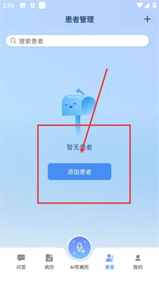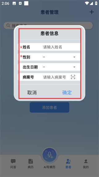 1、在患者管理頁點(diǎn)擊【添加患者】按鈕,就能觸發(fā)患者信息填寫彈窗,開始錄入患者資料啦。