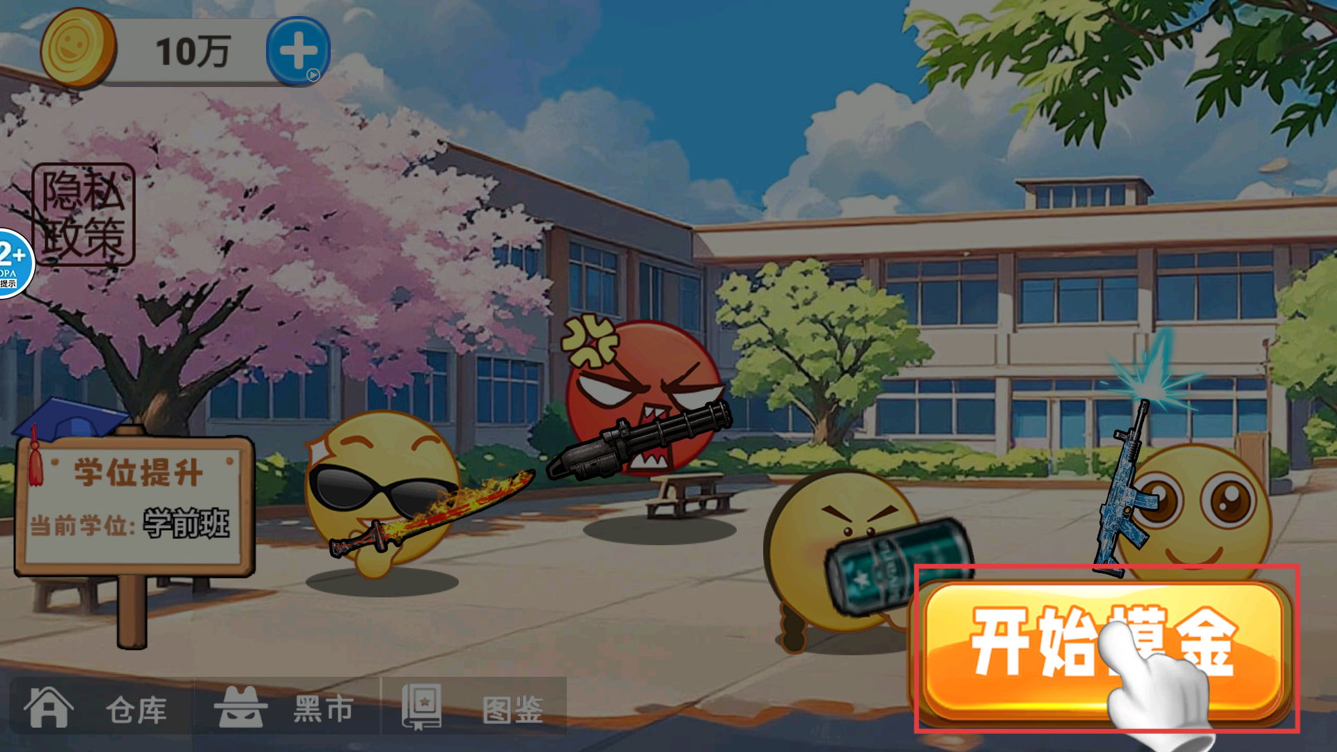 1、點擊【開始摸金】按鈕進入游戲,準備在校園地圖收集物資槍械,擊敗敵人提升收益。