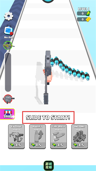 1、在關卡界面滑動觸發【SLIDETOSTART!】,進入Level1,同時可解鎖槍支進化、子彈等級等功能。