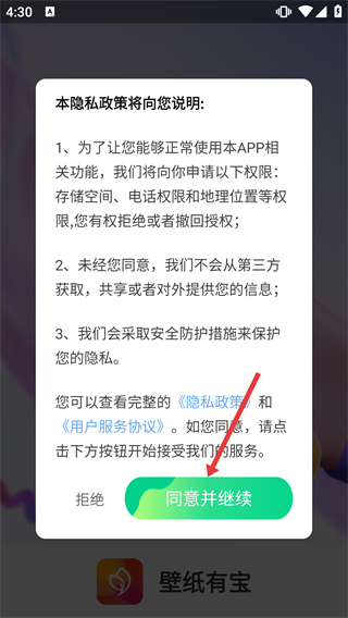 1、看到隱私政策彈窗,含【存儲空間】【電話權限】等授權說明,點擊【同意并繼續】按鈕,即可進入軟件使用壁紙功能。