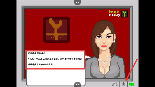 4、完成關(guān)卡后查看新聞播報(bào)(顯示感染數(shù)據(jù)),點(diǎn)擊【開關(guān)】推進(jìn)流程,積累資源解鎖更多區(qū)域。