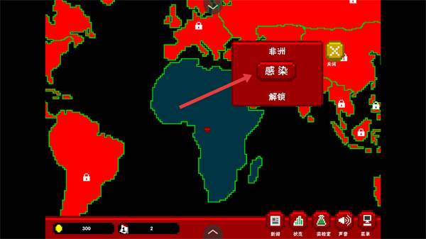 1、在世界地圖界面選擇區(qū)域(如非洲),點(diǎn)擊【感染】進(jìn)入對應(yīng)關(guān)卡,消耗資源解鎖區(qū)域。