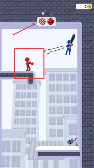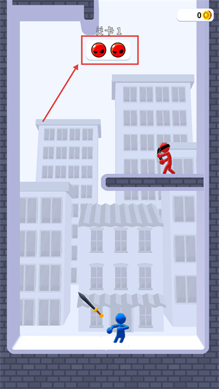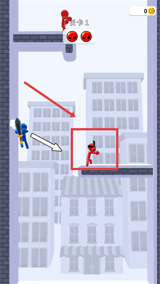 1、觀察高處的【敵人】群,控制火柴人瞬移至其位置,同時注意所剩敵人數量。