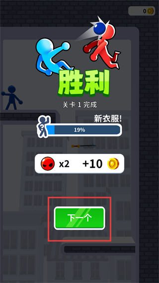 4、完成關卡后,點擊【下一個】按鈕進入新關卡,收集【金幣】與獎勵,提升角色裝備能力。