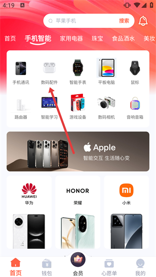 1、在購物應用的手機智能分類頁,點擊【數碼配件】選項,可進入對應品類的商品列表頁面,查看相關產品。