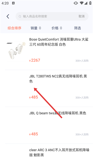 2、進入數碼配件列表頁,可瀏覽如【JBL-T280TWS-NC2真無線降噪耳機-黑色】等商品,按需選擇目標商品。