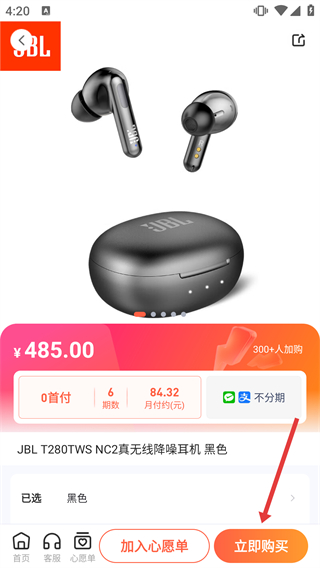 3、進入目標商品詳情頁,確認【JBL-T280TWS-NC2真無線降噪耳機-黑色】信息后,點擊【立即購買】推進下單。