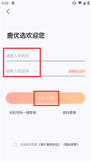 4、下單前需登錄時,在登錄頁填【請輸入手機號】和驗證碼,點擊【注冊/登錄】完成賬號驗證。