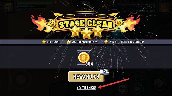 4、通關后出現【STAGE-CLEAR】界面,選擇【NO-THANKS!】可直接結算【354-金幣】獎勵。