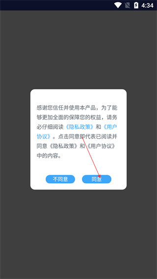 1、在彈出的協議確認彈窗中,點擊【同意】,確認《隱私政策》和《用戶協議》。
