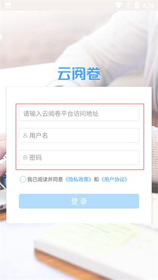 2、進入登錄頁面后,依次填寫“云閱卷平臺訪問地址”“用戶名”“密碼”對應的信息。