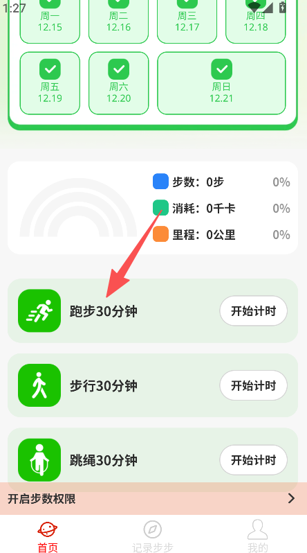 1、打開首頁,選擇目標(biāo)運(yùn)動(dòng)項(xiàng)目,點(diǎn)擊開始計(jì)時(shí)開展運(yùn)動(dòng)。