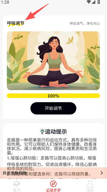 2、進(jìn)入記錄步步頁面,選擇呼吸調(diào)節(jié)選項(xiàng),進(jìn)入對(duì)應(yīng)功能頁面。