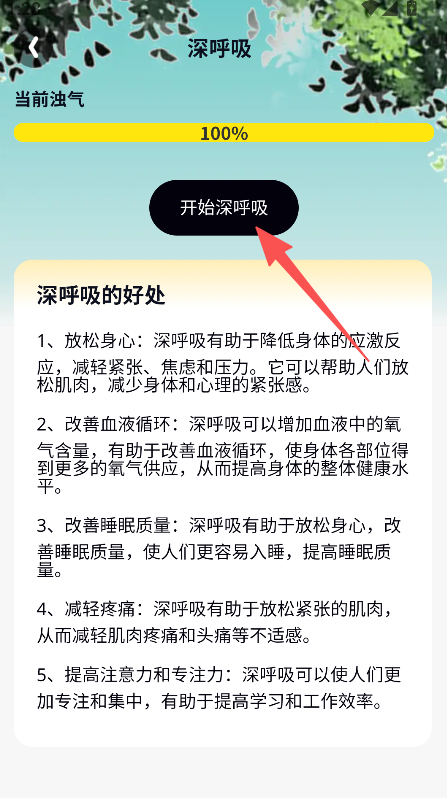 3、在呼吸調(diào)節(jié)頁面,點(diǎn)擊開始深呼吸,完成深呼吸放松練習(xí)。