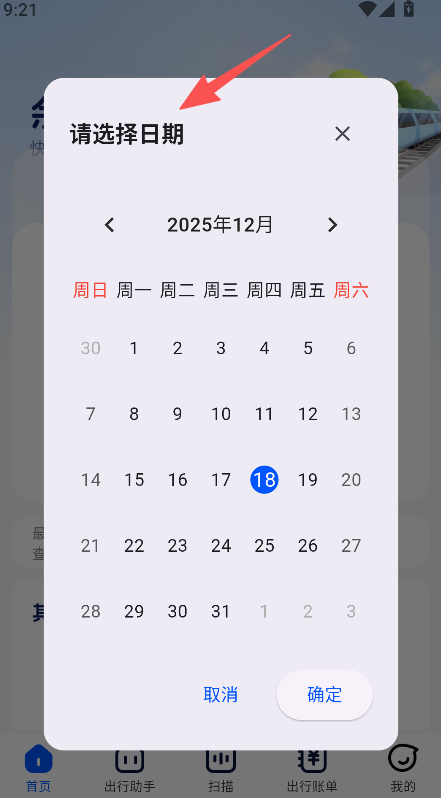 2、日期選擇界面清晰直觀,支持月份切換與日期選定,便捷完成出行日期的選擇操作。