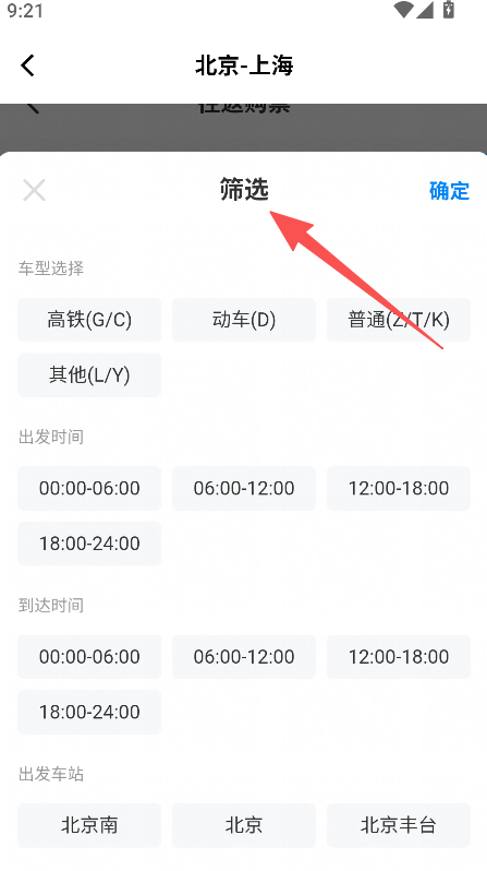 2、支持多維度篩選功能,選擇車型、出發到達時間、出發站等條件,篩選出適配的車次。