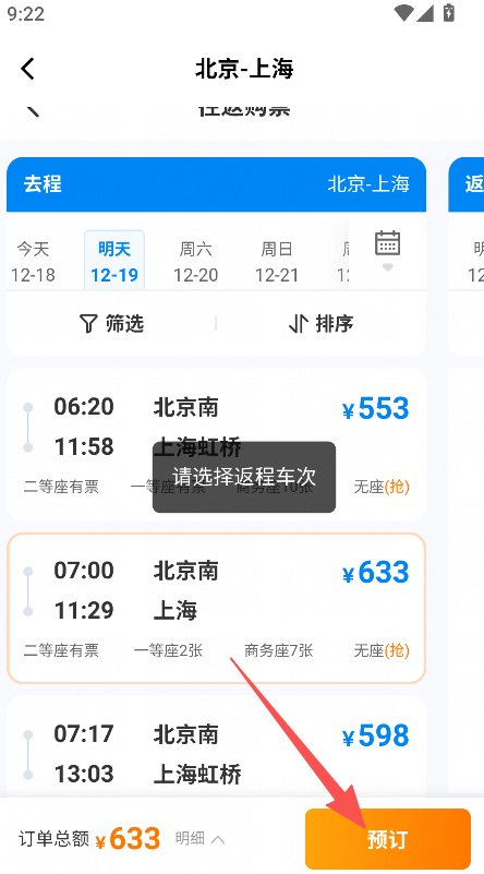 3、車次查詢與預訂流程銜接緊密,篩選后即可直接選擇車次預訂,減少操作環節的繁瑣。