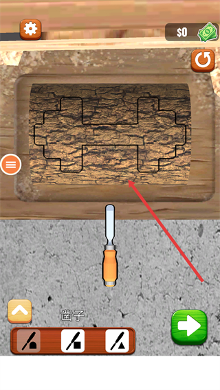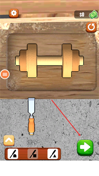 3、繼續(xù)使用【鑿子】工具,依照木材上顯示的啞鈴形狀輪廓進(jìn)行精細(xì)雕刻,完成后點(diǎn)擊右側(cè)箭頭進(jìn)入下一步。