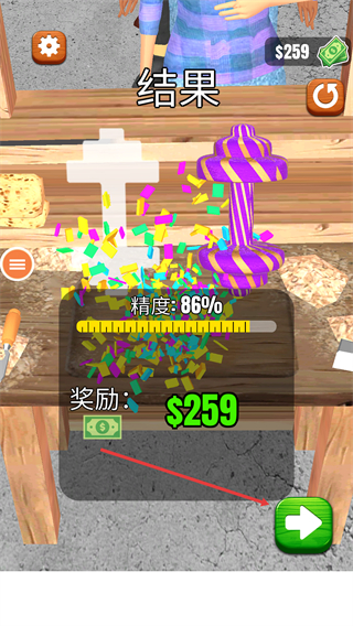 4、加工完成后查看【結(jié)果】,當(dāng)前【精度:-86%】可獲得【獎(jiǎng)勵(lì):-$259】,點(diǎn)擊箭頭按鈕進(jìn)入下一輪訂單流程。