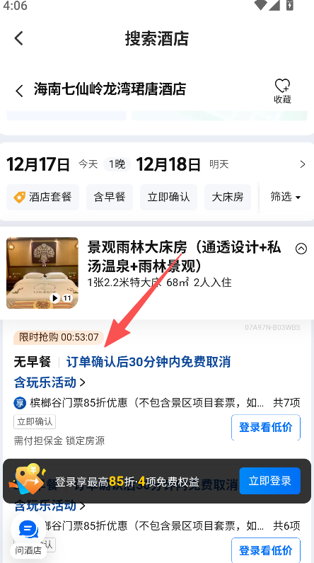 2、詳情頁信息覆蓋全面,包含房型參數、活動優惠及取消規則,助力快速了解酒店情況。