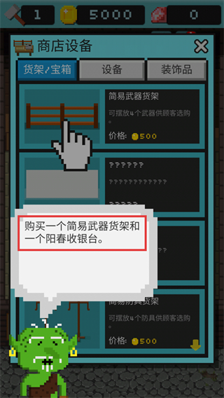 3、進入【商店設備】界面,選擇【簡易武器貨架】花費【500】金幣購買,增加武器展示位,吸引顧客選購。