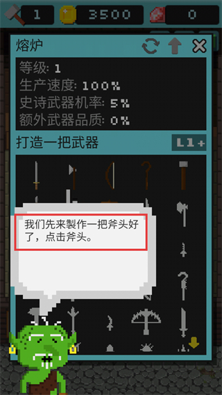 4、在【熔爐】界面選擇【斧頭】進行打造,利用等級1的生產速度,為顧客提供基礎武器,助力冒險獲取材料。