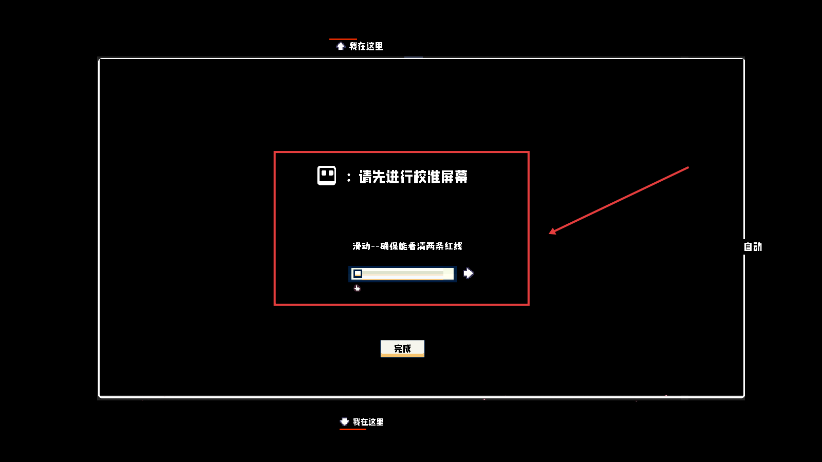 1、進入游戲前先完成【校準屏幕】操作,拖動滑塊確保覆蓋兩條紅線,完成后點擊【完成】進入下一步。